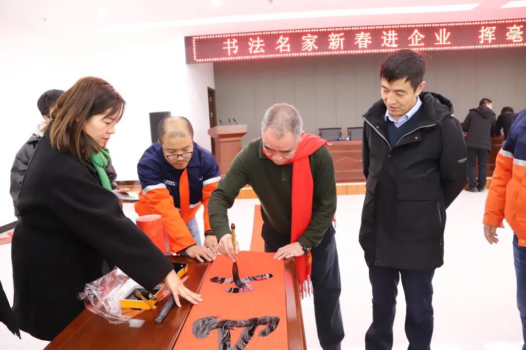 1月26日下午,蘭州新區(qū)美術(shù)家、書法家協(xié)會(huì)主席王先銀,副主席王安祥(2021年中國共產(chǎn)黨成立100周年獲得人民藝術(shù)家榮譽(yù)稱號(hào)),秘書長魏世全等6名書法名家赴石化集團(tuán)同集團(tuán)黨委副書記、總經(jīng)理姜錦,工會(huì)主席劉東斌,副總經(jīng)理李剛,總工程師葉得強(qiáng)一道為公司員工送“?!?、送春聯(lián),提前送上了新春的祝福與問候。