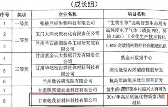 近日,從第十一屆中國創(chuàng)新創(chuàng)業(yè)大賽(甘肅賽區(qū))組委會(huì)獲悉,蘭州新區(qū)專精特新化工產(chǎn)業(yè)孵化基地的兩家入駐企業(yè)——甘肅峻茂新材料科技有限公司和蘭州昱重醫(yī)藥科技有限公司分別榮獲第十一屆中國創(chuàng)新創(chuàng)業(yè)大賽(甘肅賽區(qū))優(yōu)秀企業(yè)獎(jiǎng)。