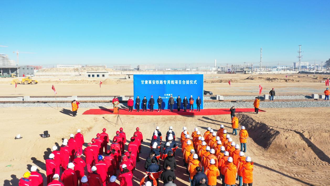 2022年1月19日上午10時,在化工物流園貨場舉行甘肅萊安鐵路專用線項目合攏儀式。蘭州新區(qū)石化集團(tuán)總經(jīng)理姜錦、蘭州新區(qū)商投集團(tuán)總經(jīng)理王堅民及中鐵二十一局、甘肅萊安能源有限公司領(lǐng)導(dǎo)出席儀式。