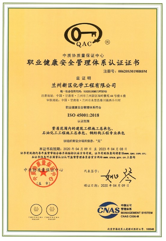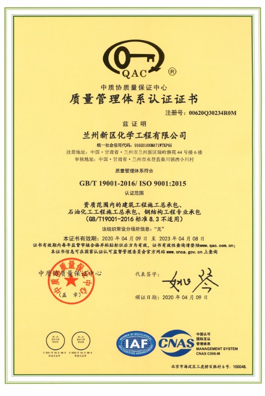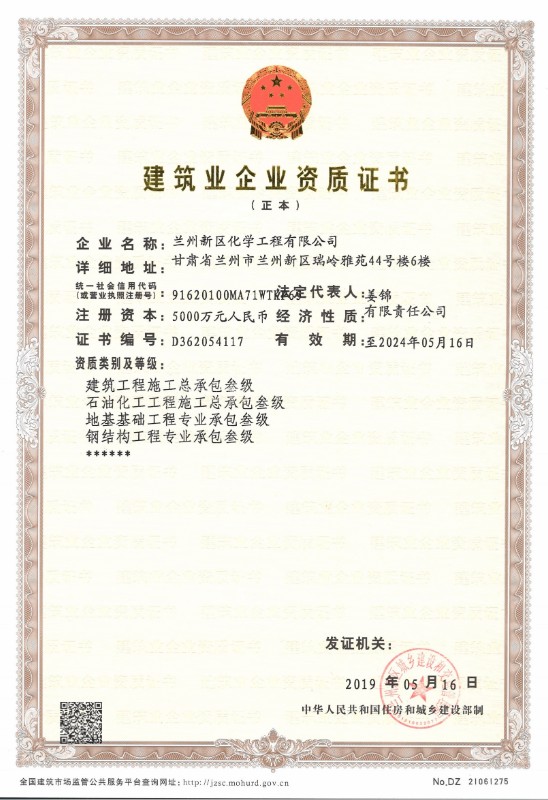 蘭州新區(qū)化學(xué)工程有限公司目前已取得了石油化工總承包三級(jí)、建筑工程總承包三級(jí)、鋼結(jié)構(gòu)專(zhuān)業(yè)承包三級(jí)、地基處理專(zhuān)項(xiàng)承包三級(jí)資質(zhì)。